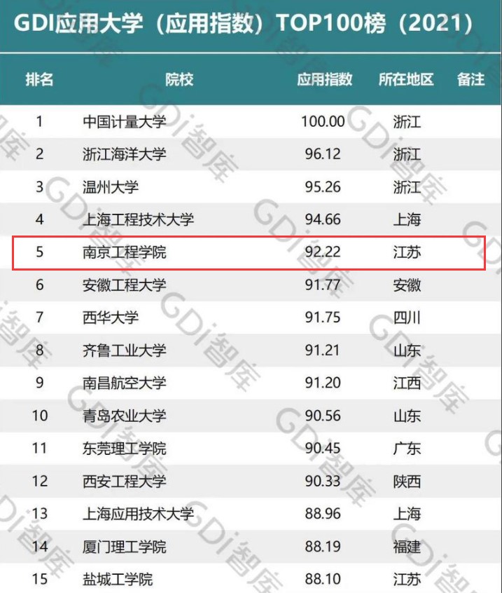 在国家倡导大力建设应用型高校的背景下,应用型高校已成为优化区域高等教育结构、服务区域产业发展的重要生力军。而社会服务作为高校的基本职能之一,在新的时代要求下,应用型高校服务区域经济社会发展、服务行业技术进步的能力也受到越来越多的关注。“GDI应用大学(应用指数)TOP100榜(2021)”显示,排名前三的高校应用指数均在95以上,12所高校应用指数超过90,我校以92.22分排名第五,充分彰显了近年来我校应用实力的显著提升和社会服务能力的显著增强。