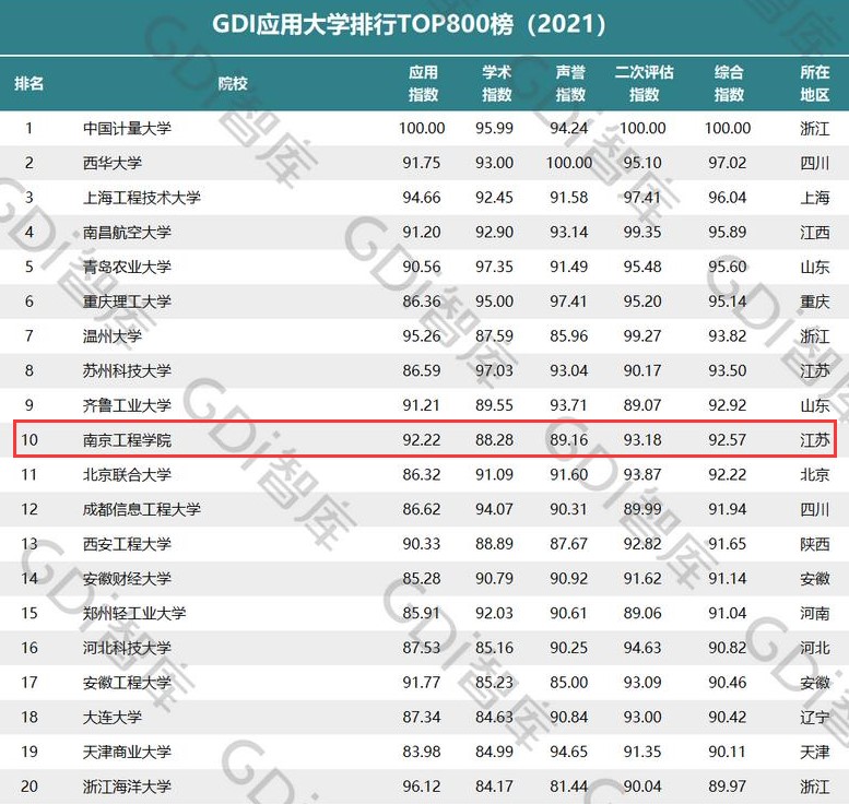 近日,GDI智库发布“GDI应用大学排行TOP800榜(2021)”,对国内893所本科院校(非博士培养单位)进行科学评估,推出“GDI应用大学排行TOP800榜(2021)”总榜单及三个分榜单。今年,我校在该排行榜中的排名再创新高,在总榜单中位列第10位,首次跻身全国前十,居全国学院类高校首位。