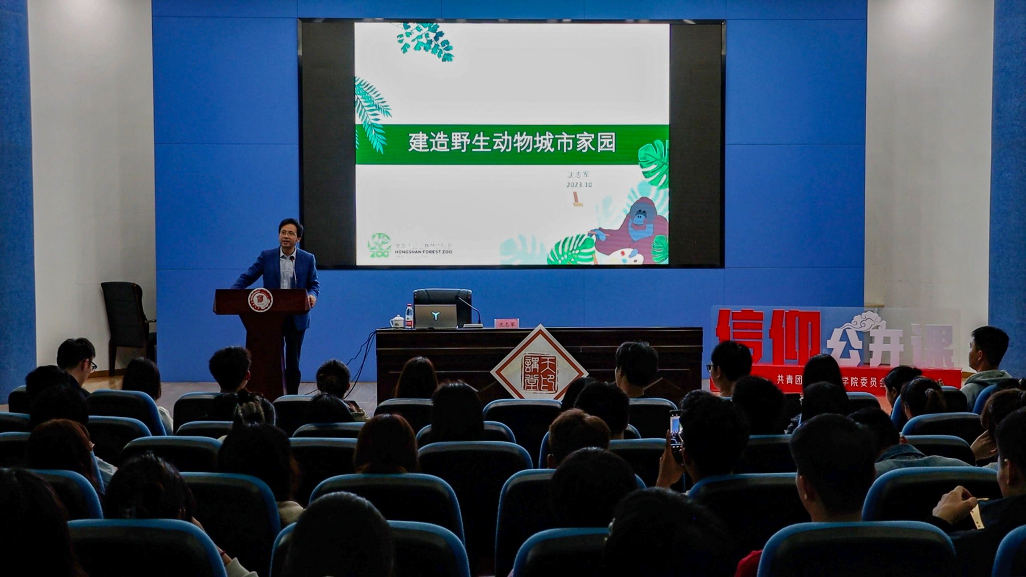 10月26日晚,我校2023-2024学年首场天印讲堂暨信仰公开课在图书馆报告厅举行。南京市红山森林动物园园长沈志军以“建造野生动物城市家园”为题,将我校200余名师生带入动物的世界,领略红山森林动物园缔造的野生动物城市家园。
