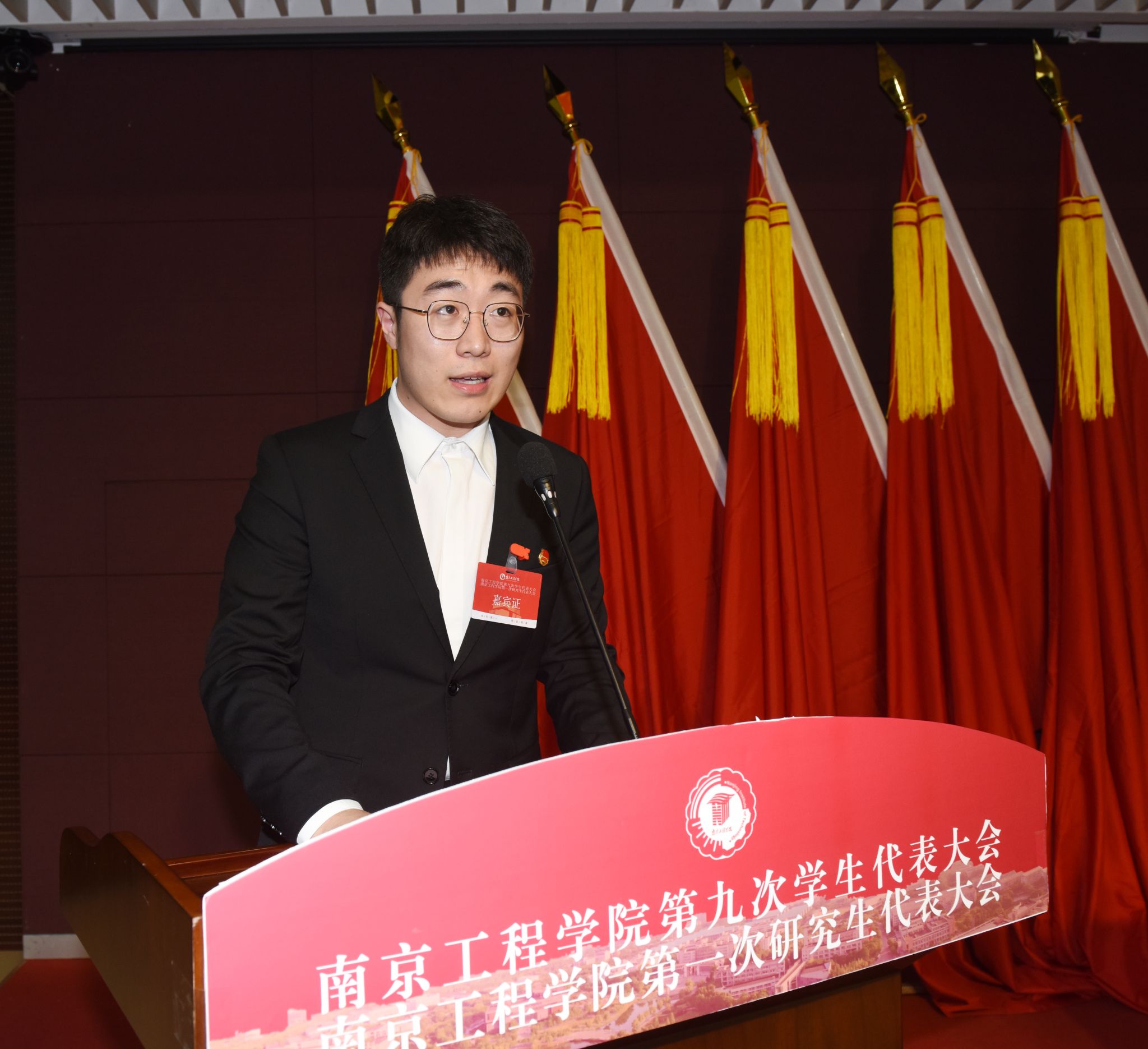 河海大学席皓代表兄弟高校学生会组织致辞。他表示,河海大学学生会愿与南工程学生会组织携手共进、交流经验,共同为全省高校学生会工作做出更大贡献。
