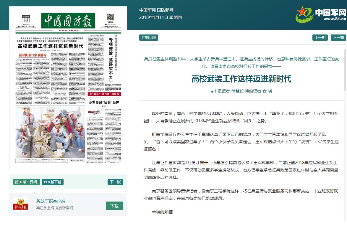 2015年,兵员征集任务明确到高校,南京市出台规定,要求市属高校按照应届毕业生数量的1.2%比例承担征兵任务。当年凯发k8官网送走新兵132人……