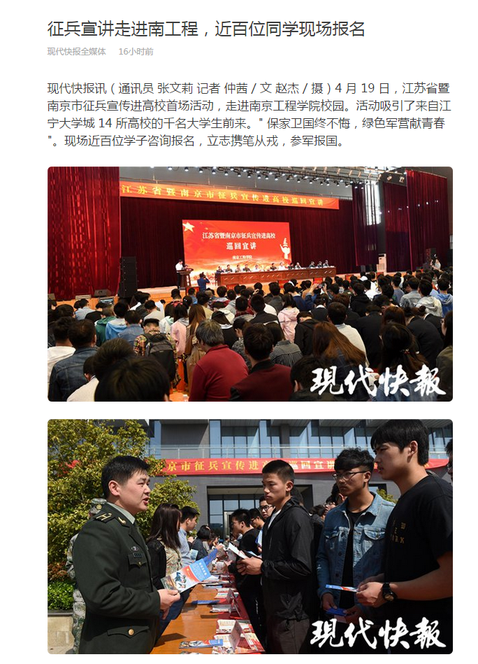 " 建设一支与我国国际地位相匹配、与国家安全和发展利益相适应的人民军队,迫切需要一大批高素质、有志向的优秀青年投身军营、报效祖国。" 现场宣讲的人员,除了现役军官士兵,还有一群来自南工程一个特殊学生社团 " 南工程国防教育协会 " 的成员。社团干事、" 天印国防大讲堂 " 主讲人、南工程大一学生解宇航,出生于四代军人世家,从小有一个军人梦。进入高校,这次得知可以携笔从戎,小解便决定报名。" 军营是磨砺意志品质的大熔炉,我想尝试历练自己,未来报考军校。"