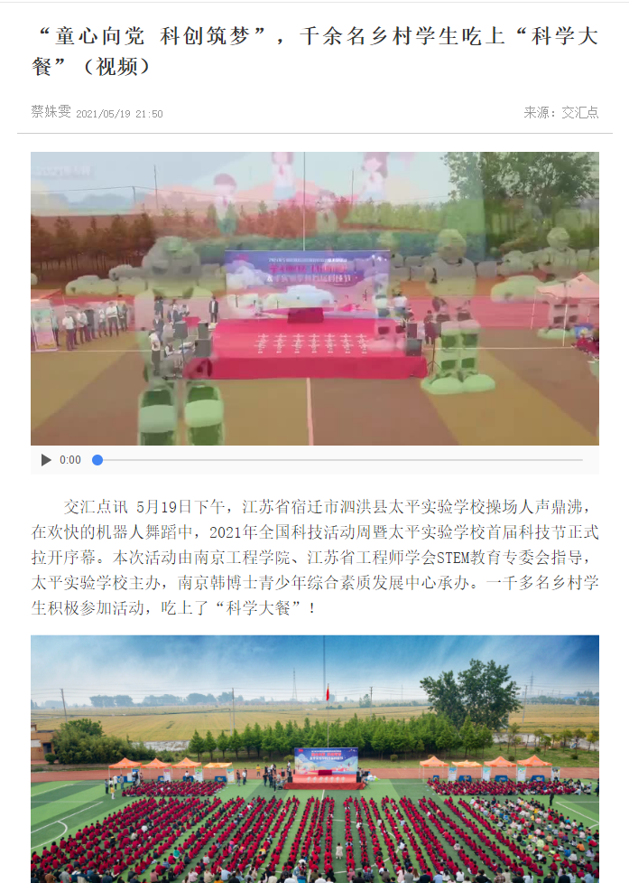 交汇点讯 5月19日下午,江苏省宿迁市泗洪县太平实验凯发操场人声鼎沸,在欢快的机器人舞蹈中,2021年全国科技活动周暨太平实验凯发首届科技节正式拉开序幕。本次活动由凯发k8官网、江苏省工程师学会STEM教育专委会指导,太平实验凯发主办,南京韩博士青少年综合素质发展中心承办。一千多名乡村学生积极参加活动,吃上了“科学大餐”!